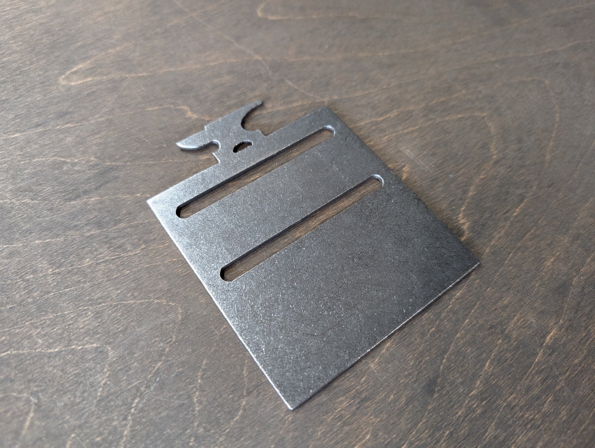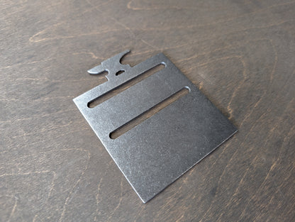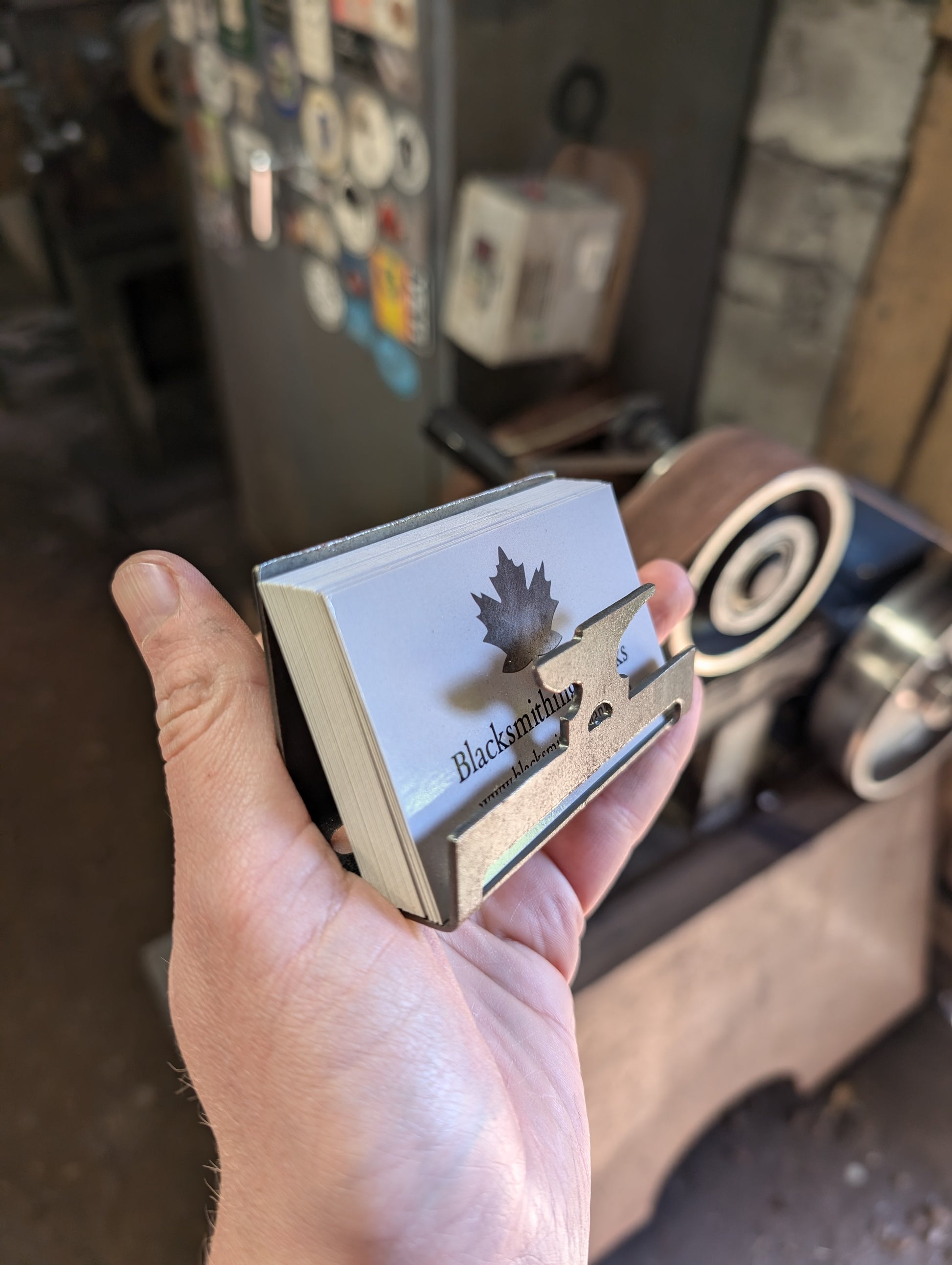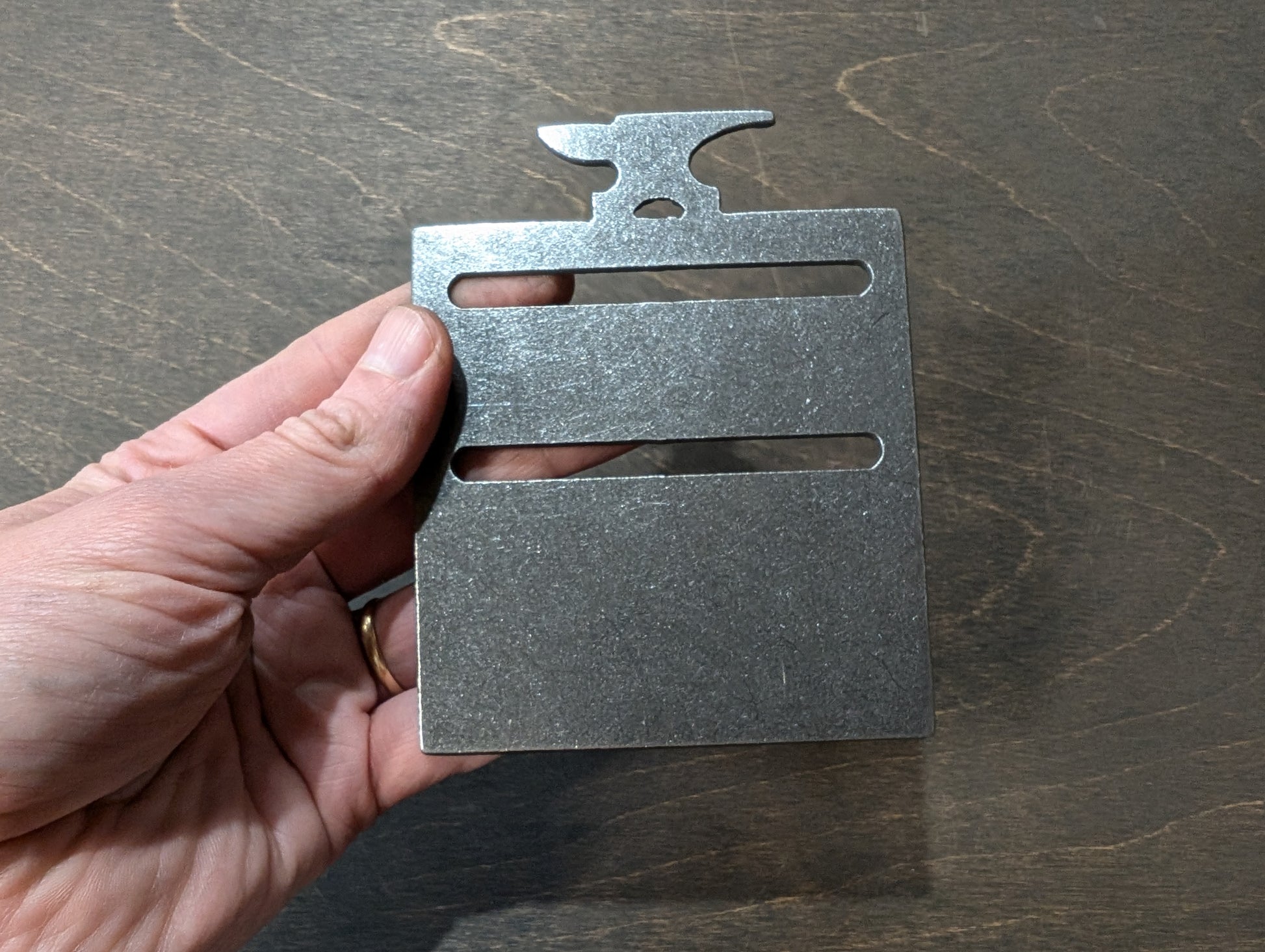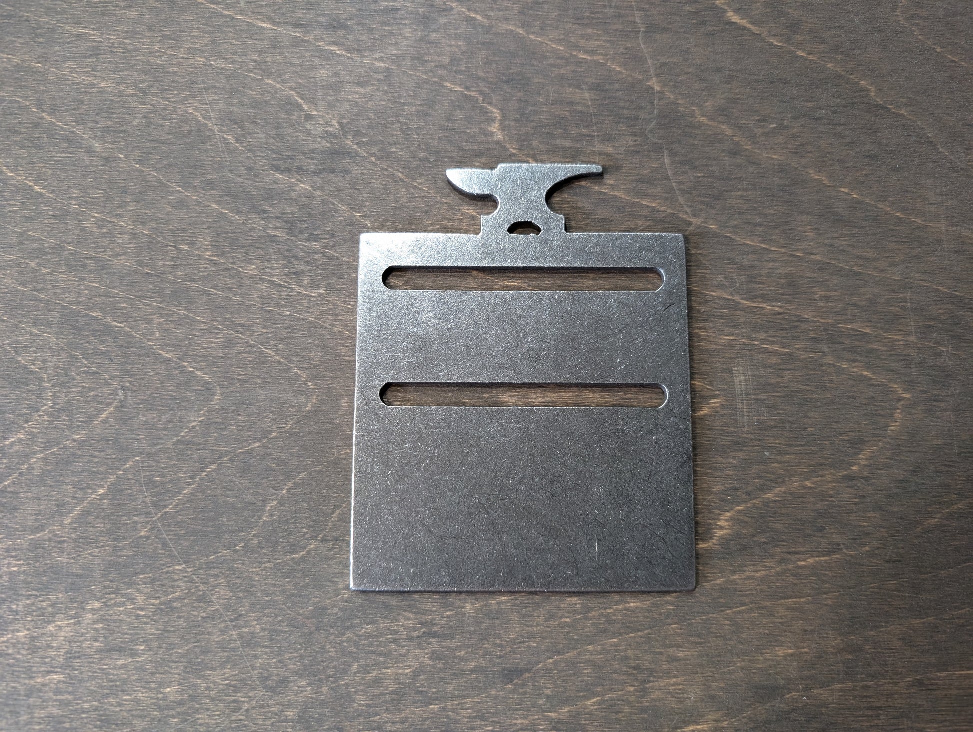 This blank will make an anvil business card holder for your blacksmithing business. It has slots to indicate where you should fold the metal. The overall blank dimensions are 3.5" wide x 4.5". It is made to hold a standard size business card, 2" x 3.5". The last photo shows what it can look like when completed.