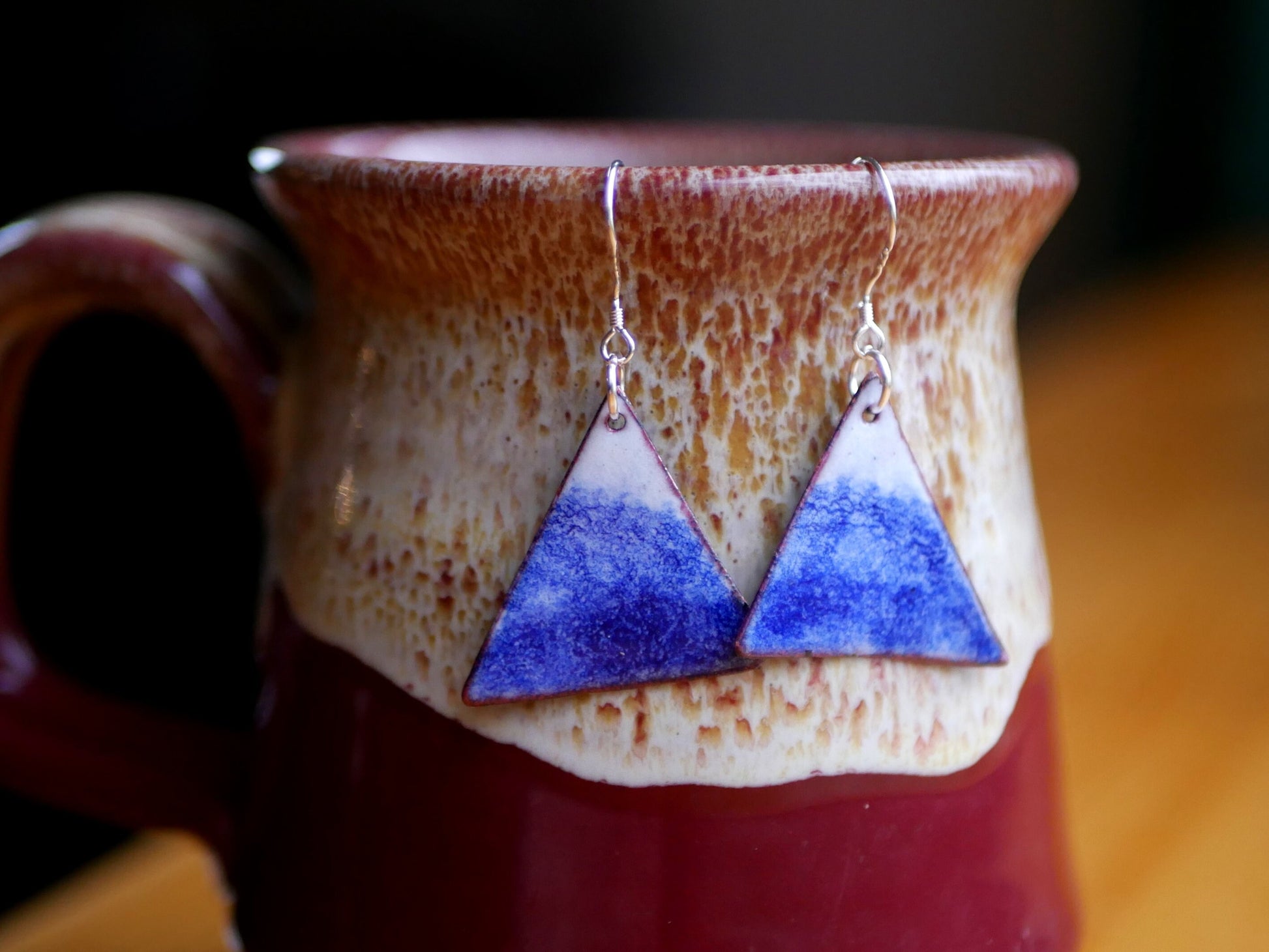 This pair of watercolor enamel short dangle mountain earrings was created by Jessica Adams at Christ Centered Ironworks. The earrings are triangle copper discs that have been enameled via the process of torch firing. These earrings were created to have a simple elegance in a modern styling.