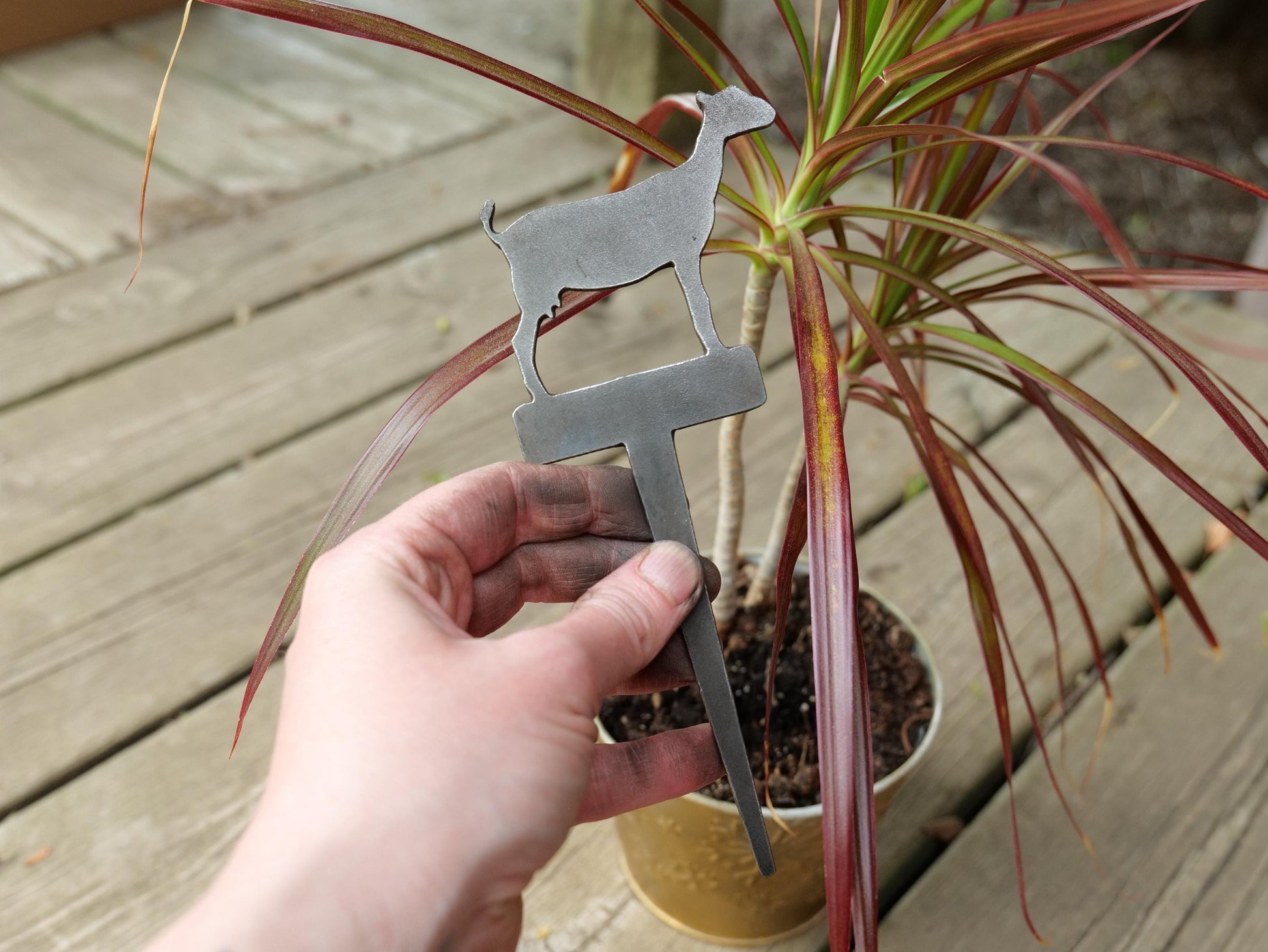 This sturdy nanny goat garden stake is made from 1/8" thick mild steel. The house plant decoration is created by using plasma cutting technology right here at Christ Centered Ironworks. Overall dimensions measure:  3-1/4" x 7-1/2" overall length.
