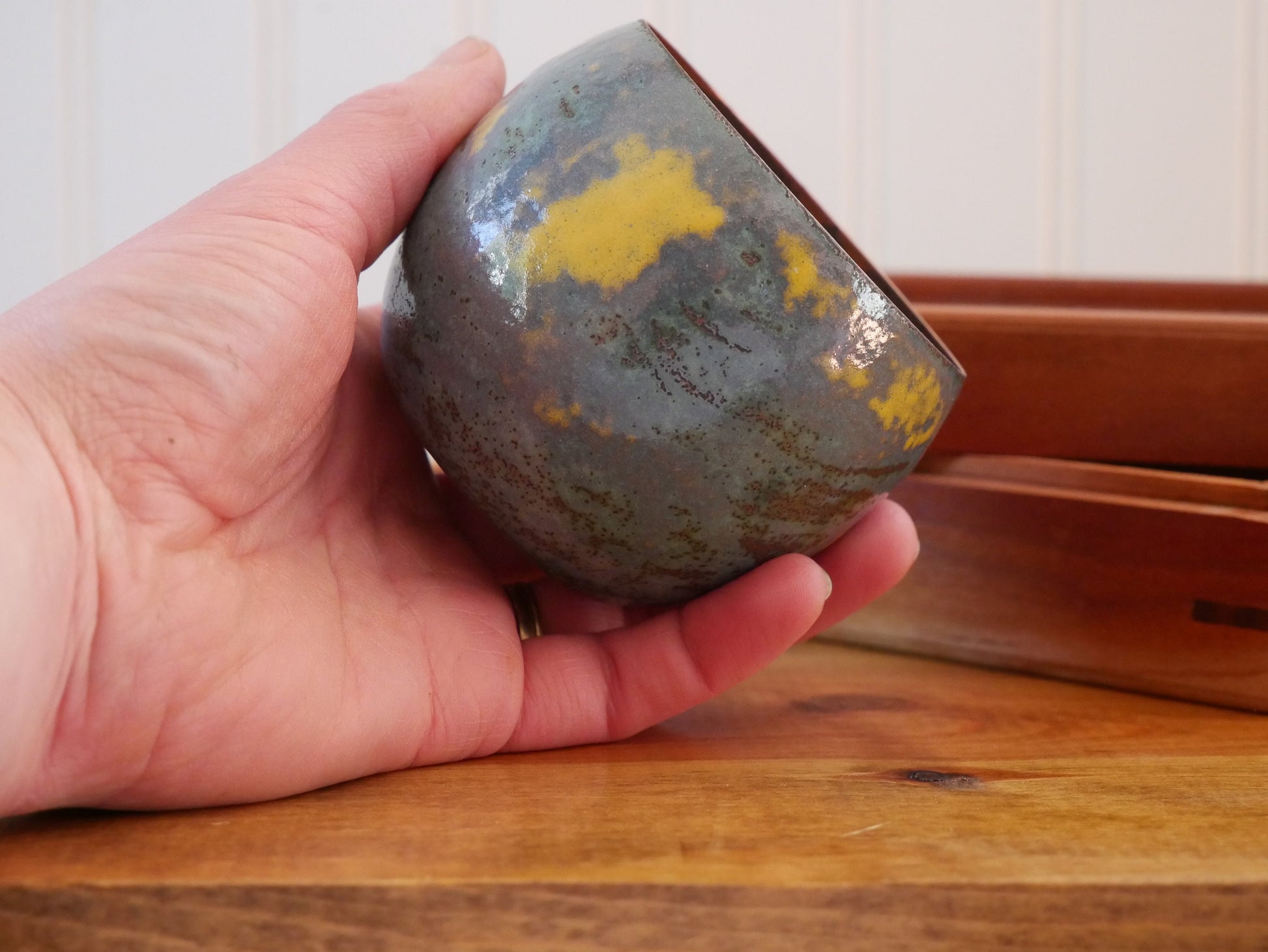 This hand enameled succulent pot was enameled by Jessica Adams of Christ Centered Ironworks. The enamel is fused to a spun copper vessel (made by another maker) via the kiln. The colors dance in the light! Enamel is glass and is quite glossy. You are getting the small planter shown in the photograph. No two of my pieces look alike!
