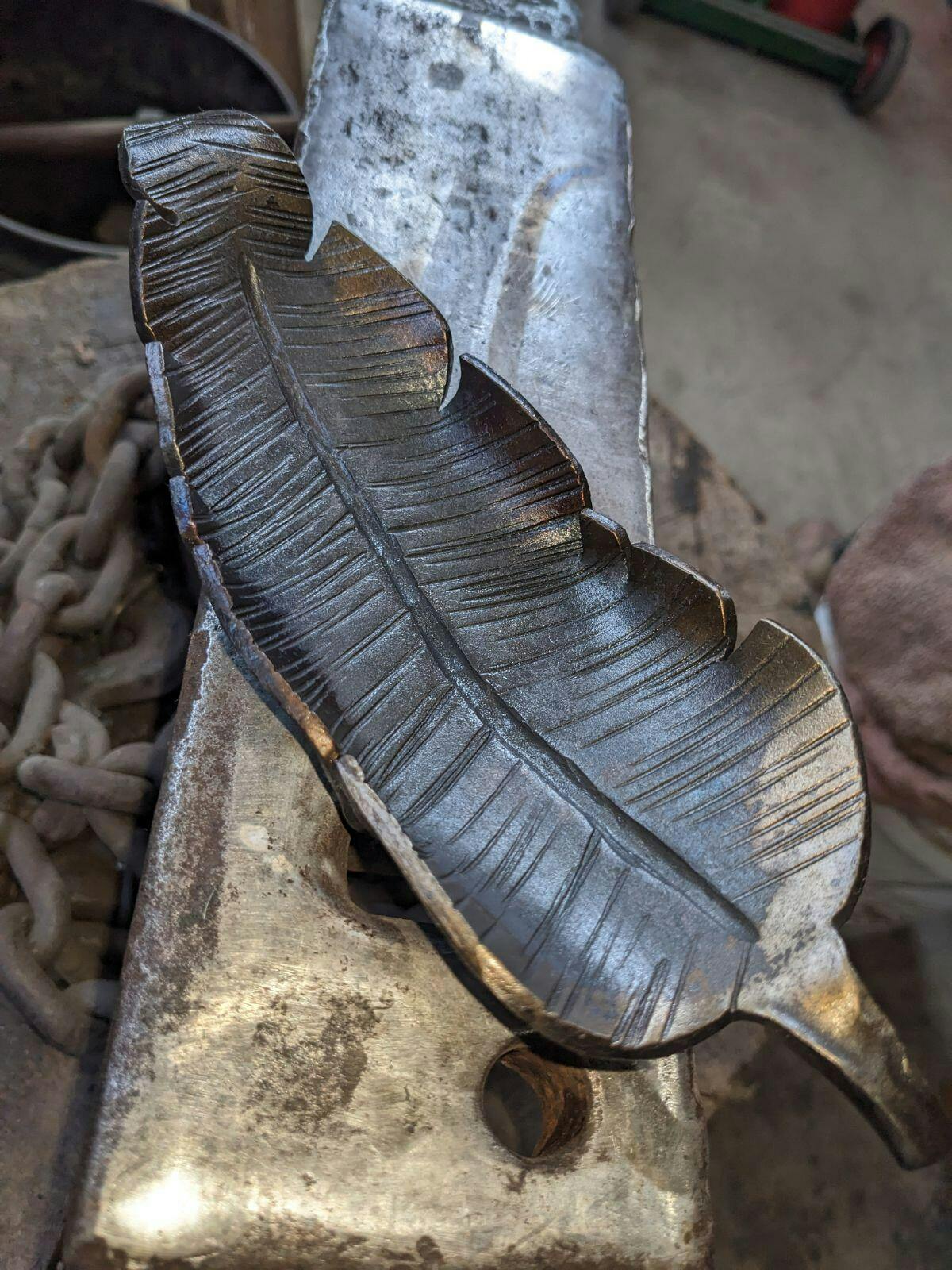 This blacksmith blank can be used to forge a feather bowl or large sculpture. This could be ornamented with chiseled lines or simply textured (last photo shows what it could look like completed).