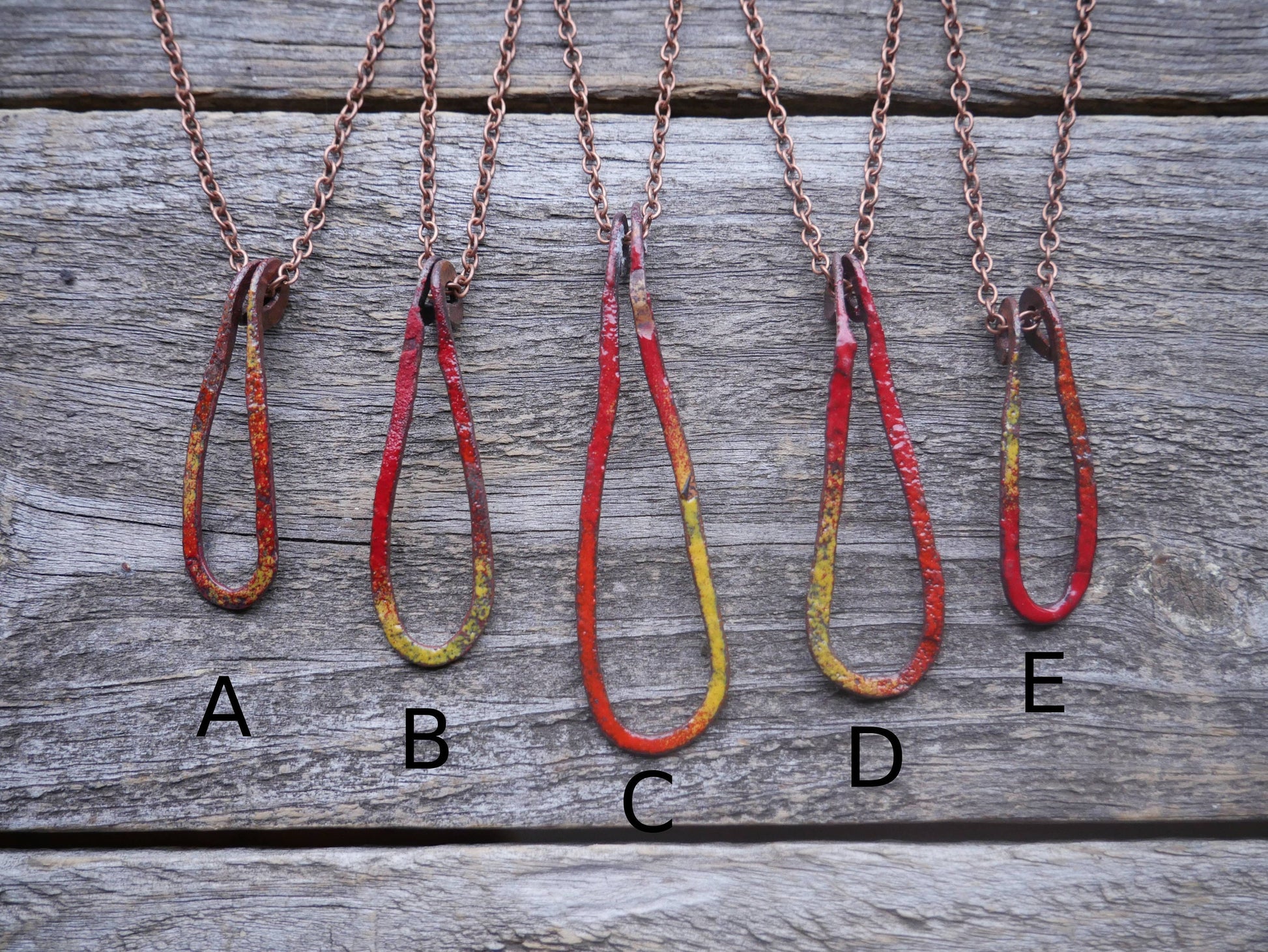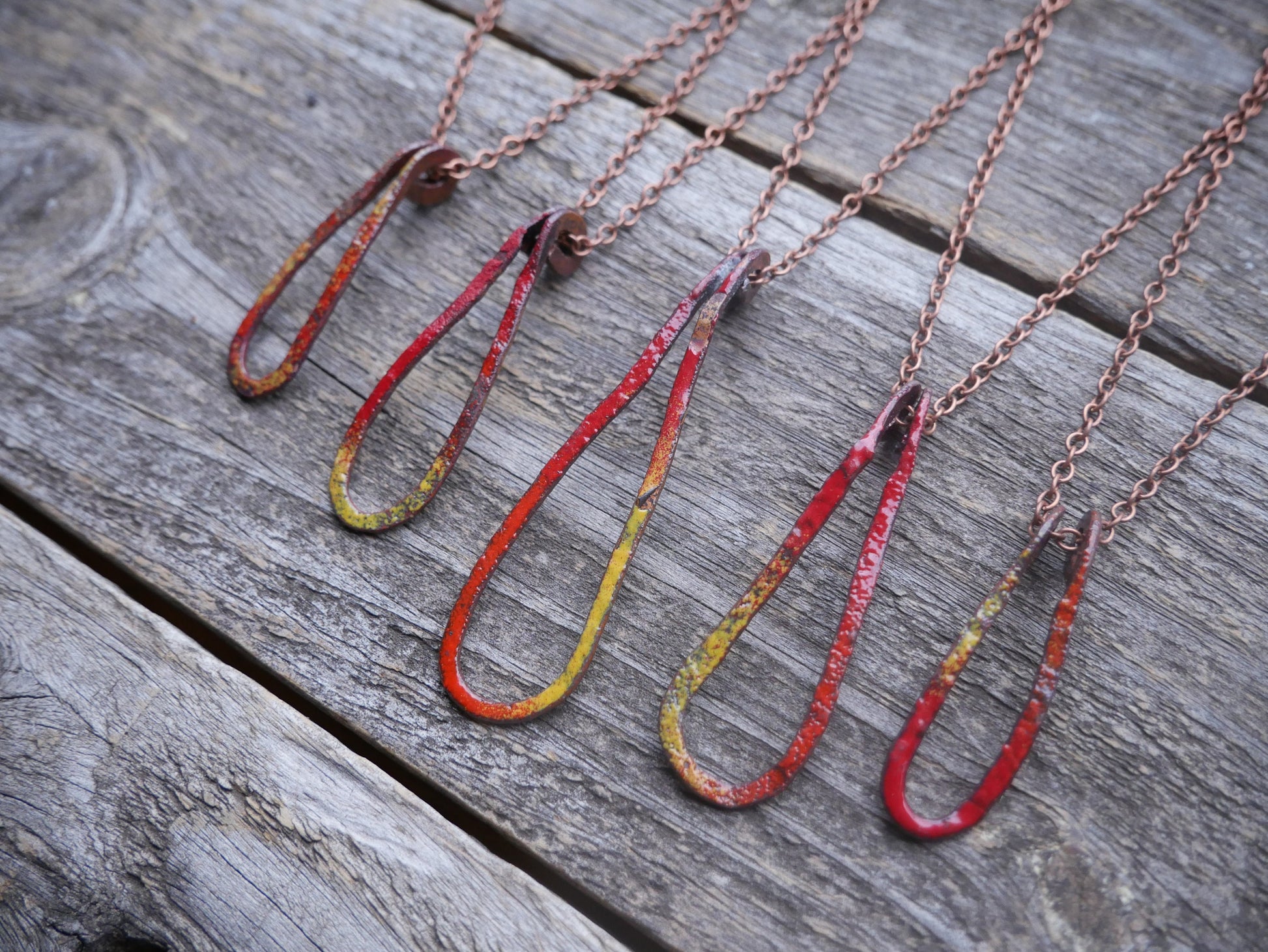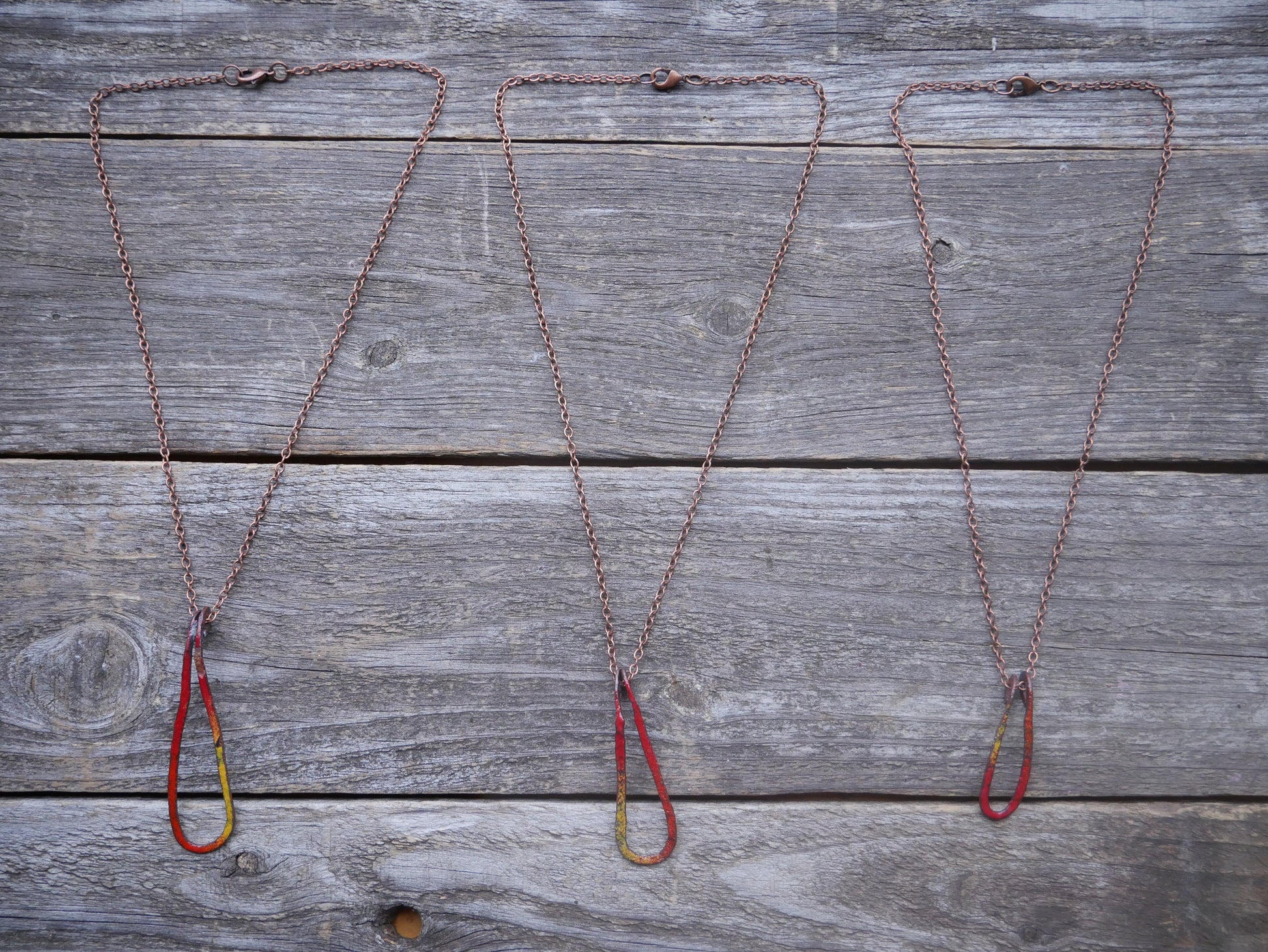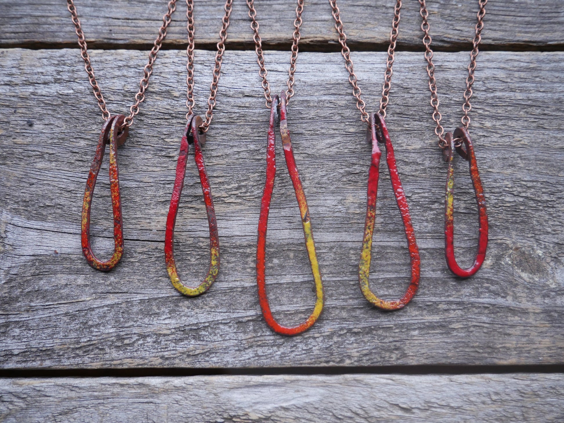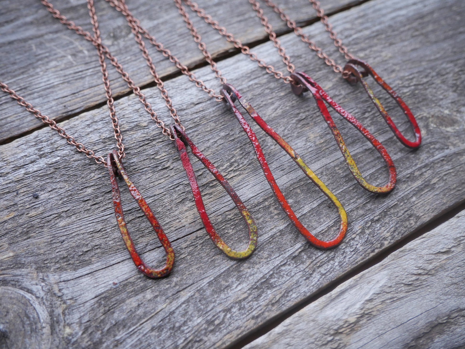 The fire droplet pendant is made from solid copper bar. You will be receiving one necklace and pendant per order. The chain is a 16" copper antiqued chain.