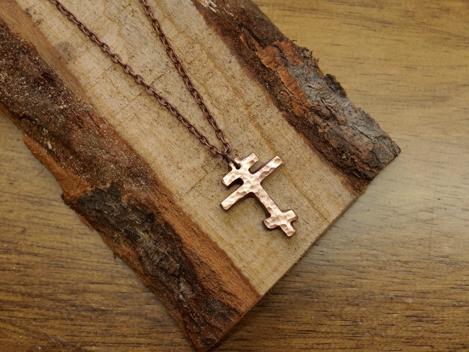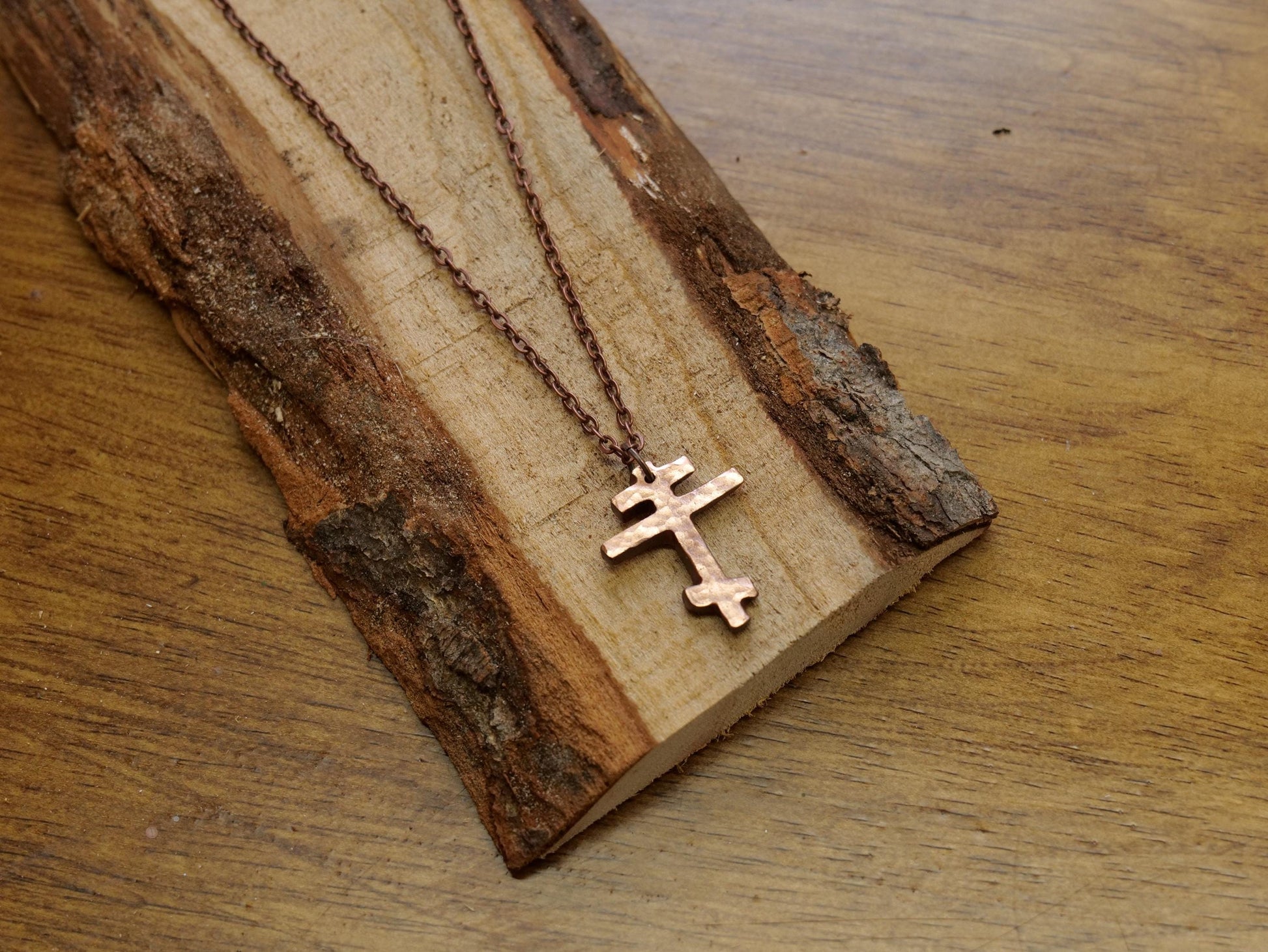 This small hammered tri bar cross necklace was made by Jessica Adams of Christ Centered Ironworks. The hammered textured Orthodox cross pendant is made from solid copper. The copper three bar cross necklace features a hammered texture. The copper cross measures 1" long and is made from 1/8" thick copper (I offer a larger version of this necklace).