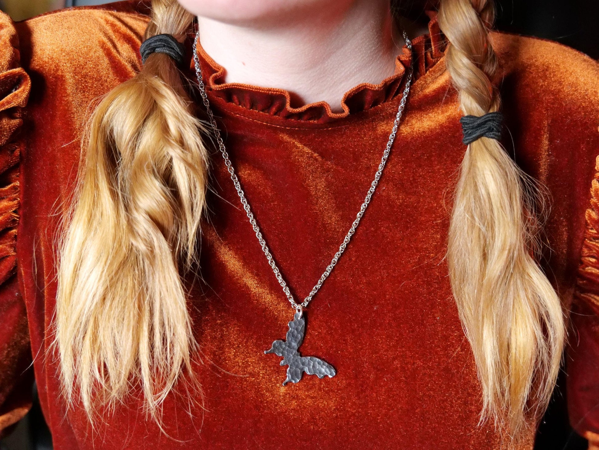 This forged butterfly necklace was made by Jessica Adams of Christ Centered Ironworks. The hammered textured butterfly pendant is made from solid steel. The steel butterfly necklace features a hammered texture.