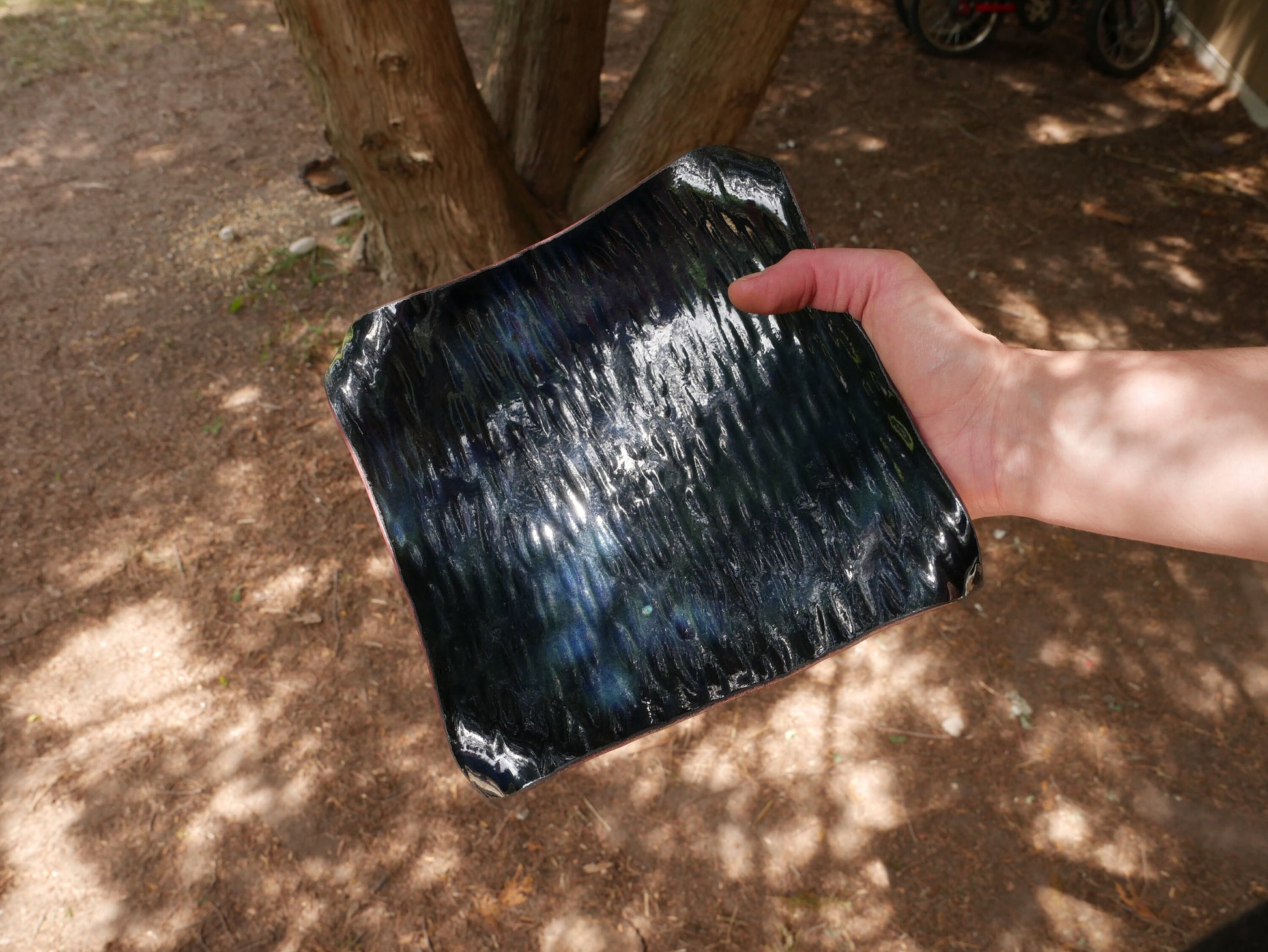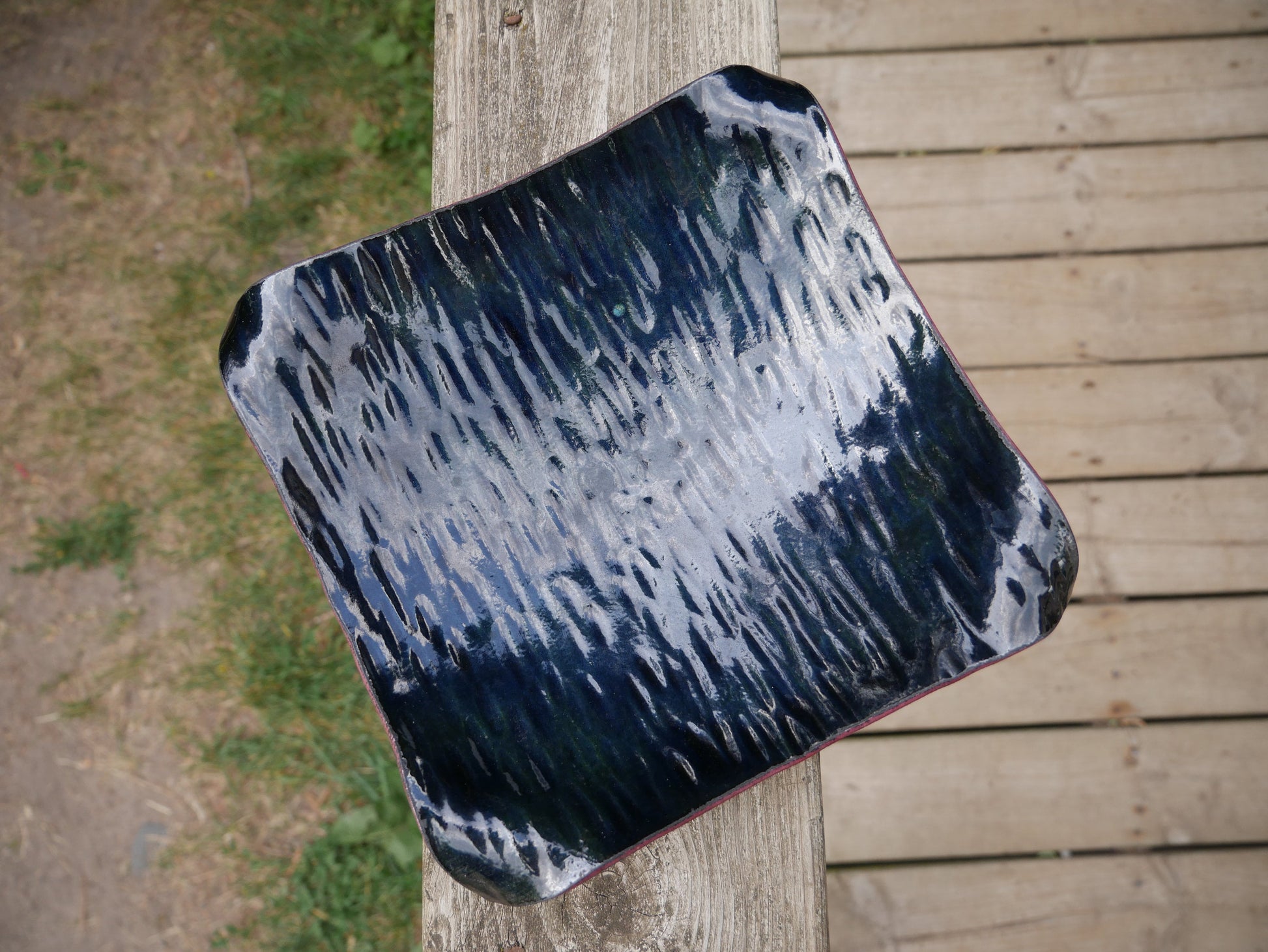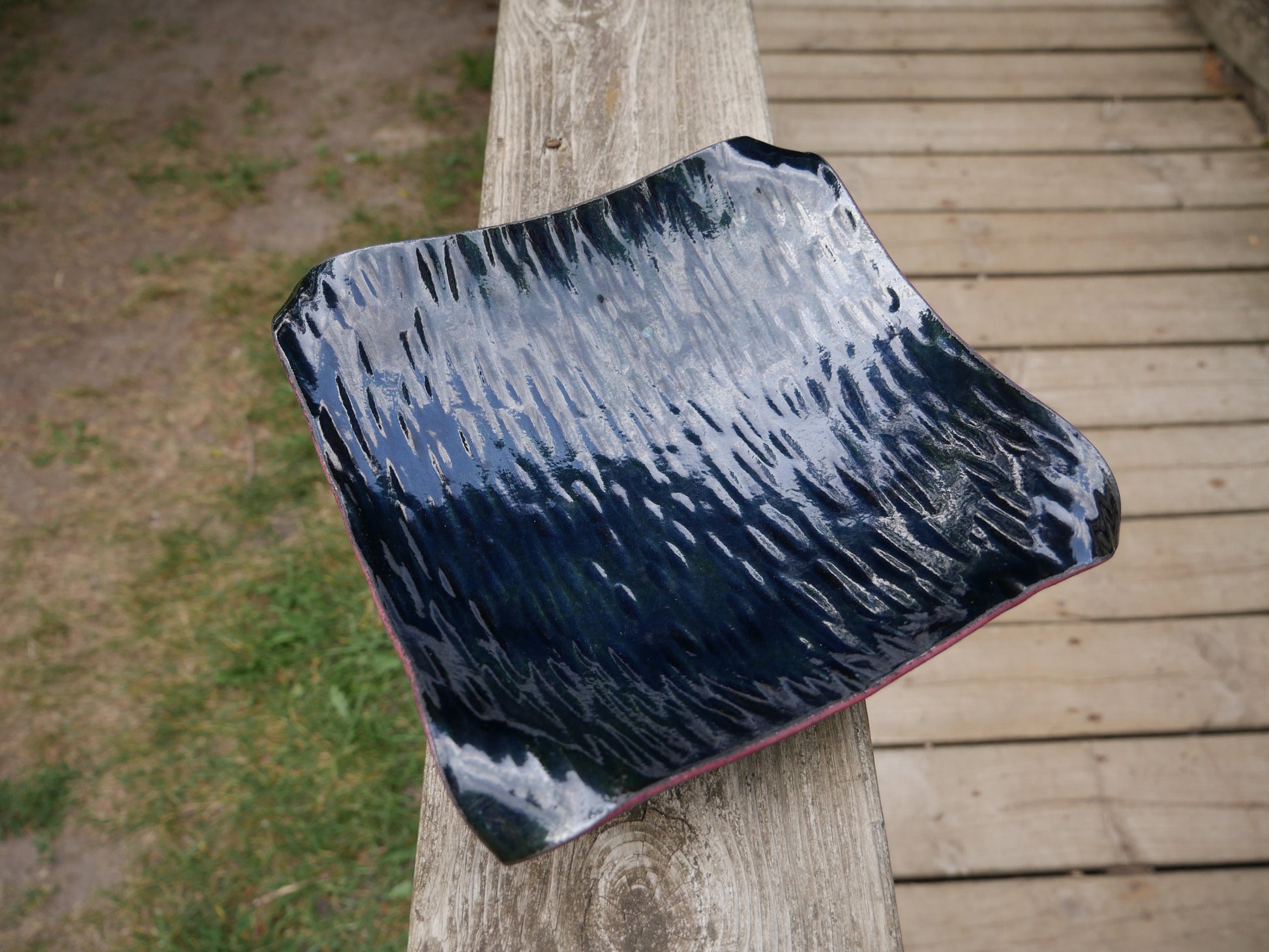 This hand forged copper dish features an enamel finish. It is made from 10 gauge copper sheet- quite heavy duty!  The enameled copper dish was forged and enameled by Jessica Adams of Christ Centered Ironworks. The front of the dish consist of semi transparent black enamel over a textured surface. The back of the dish has turquoise enamel on it.