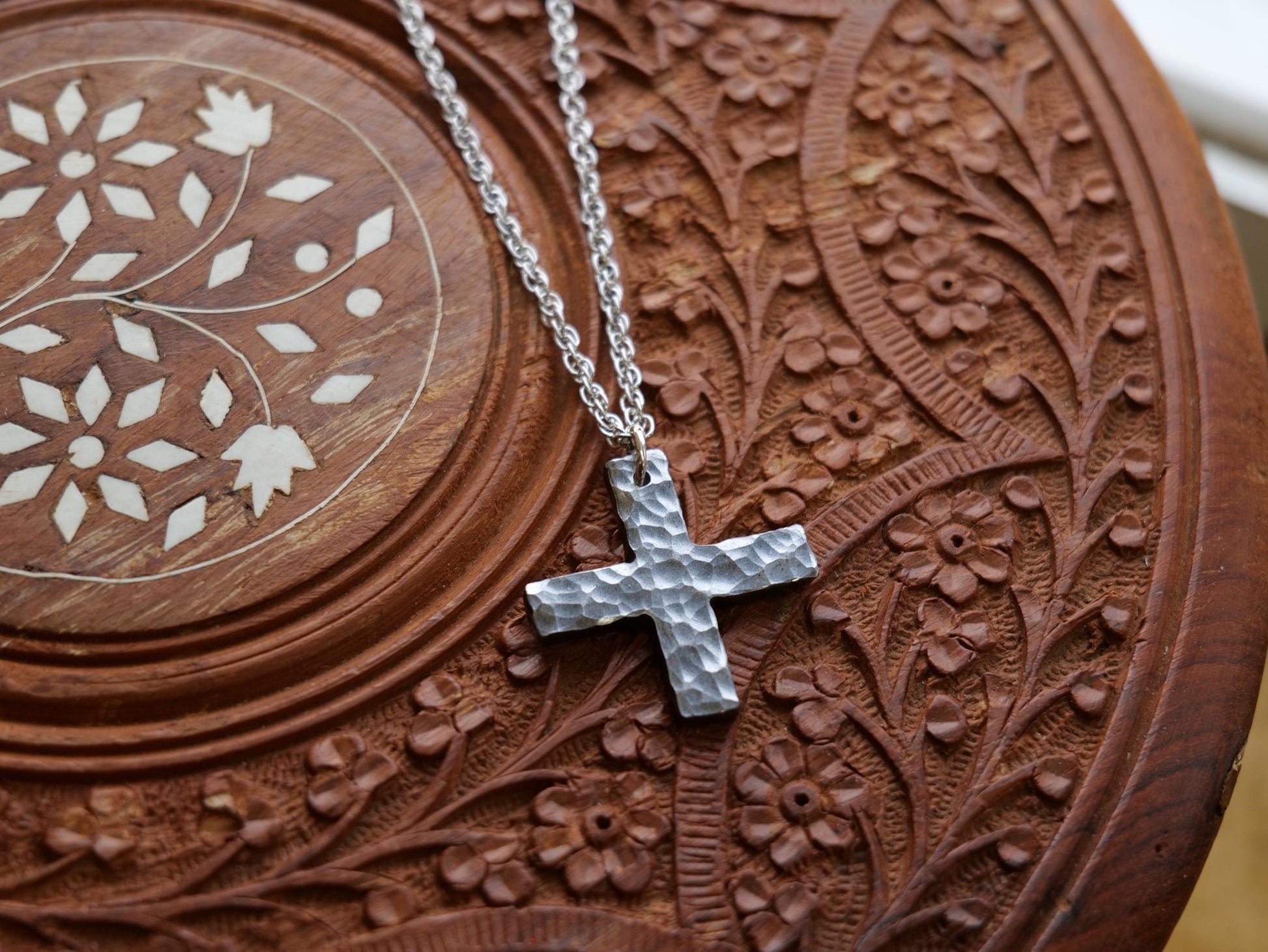 This forged Greek cross necklace was made by Jessica Adams of Christ Centered Ironworks. The hammered textured Greek cross pendant is made from solid steel. The steel Greek cross necklace features a hammered texture.