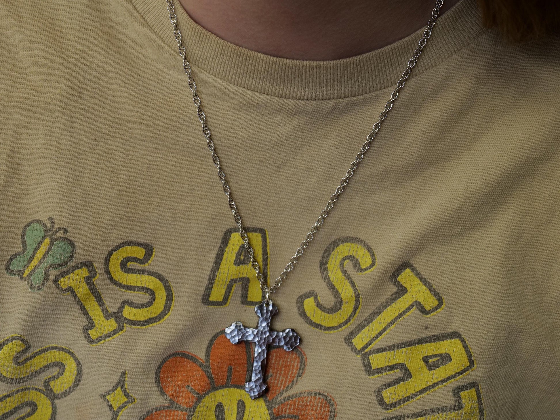This forged Catholic Cross necklace was made by Jessica Adams of Christ Centered Ironworks. The hammered textured cross pendant is made from solid steel. The orthodox cross necklace features a hammered texture.