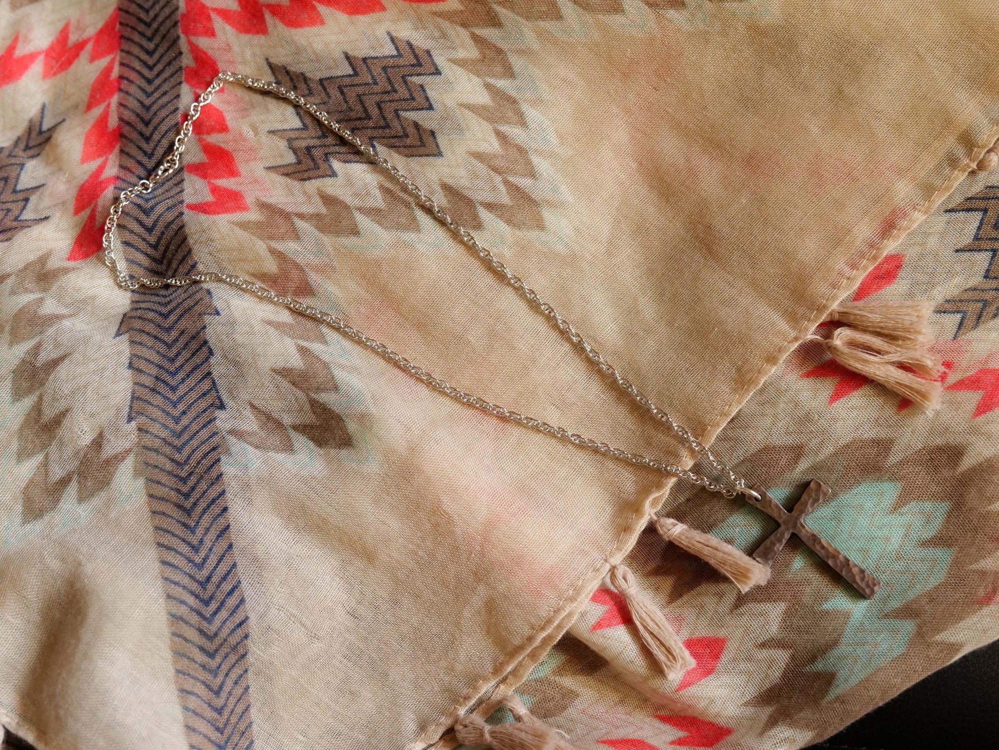 This forged decorative cross necklace was made by Jessica Adams of Christ Centered Ironworks. The hammered textured cross pendant is made from mild steel. The metal Christian cross necklace features a hammered texture.