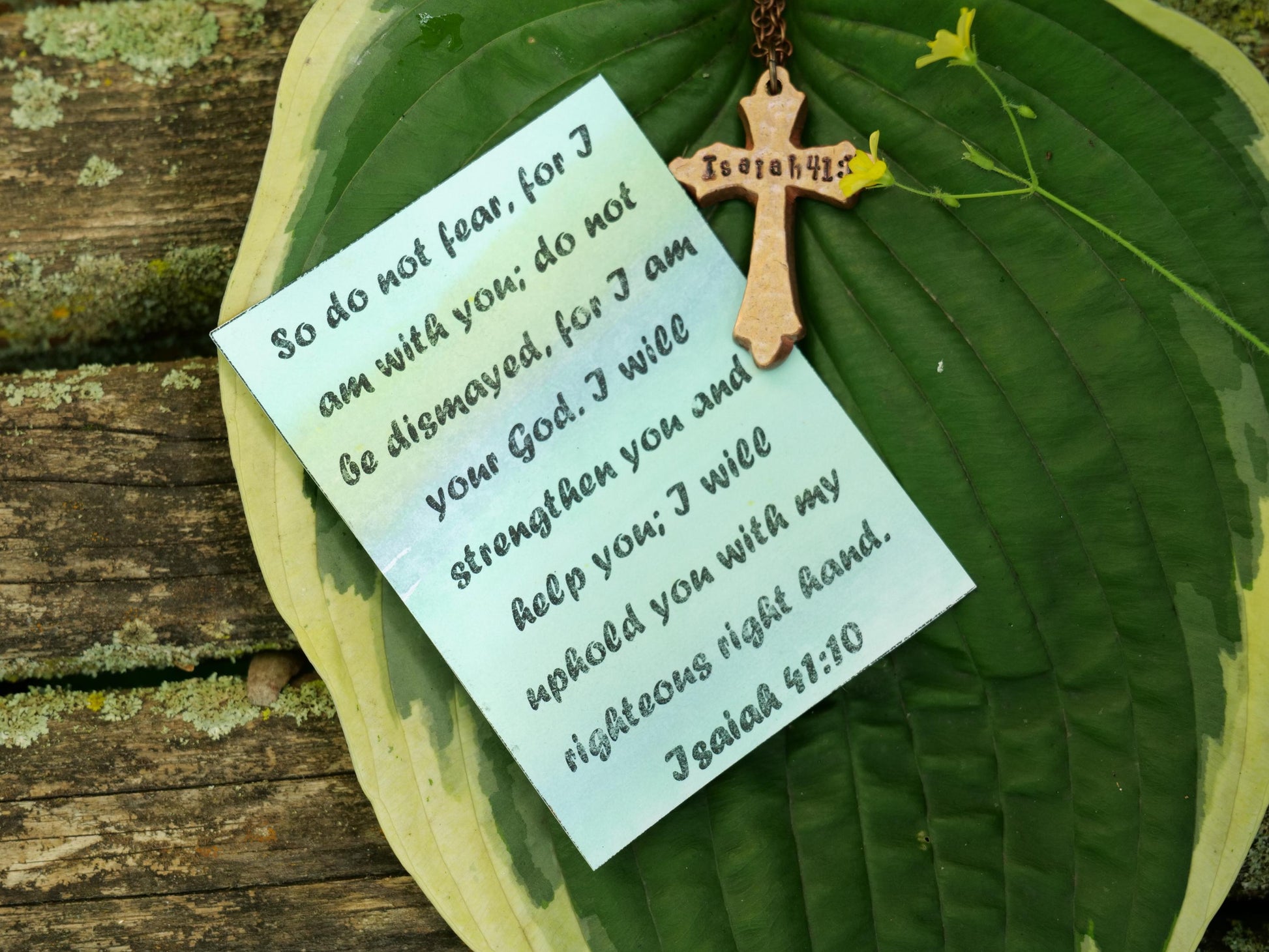 This forged decorative cross necklace was made by Jessica Adams of Christ Centered Ironworks. The hammered textured cross pendant is made from solid copper. The copper Christian cross necklace features Isaiah 41:10 which says, "So do not fear, for I am with you; do not be dismayed, for I am your God. I will strengthen you and help you; I will uphold you with my righteous right hand." It will come on a print of the jewelry card shown in the photograph.