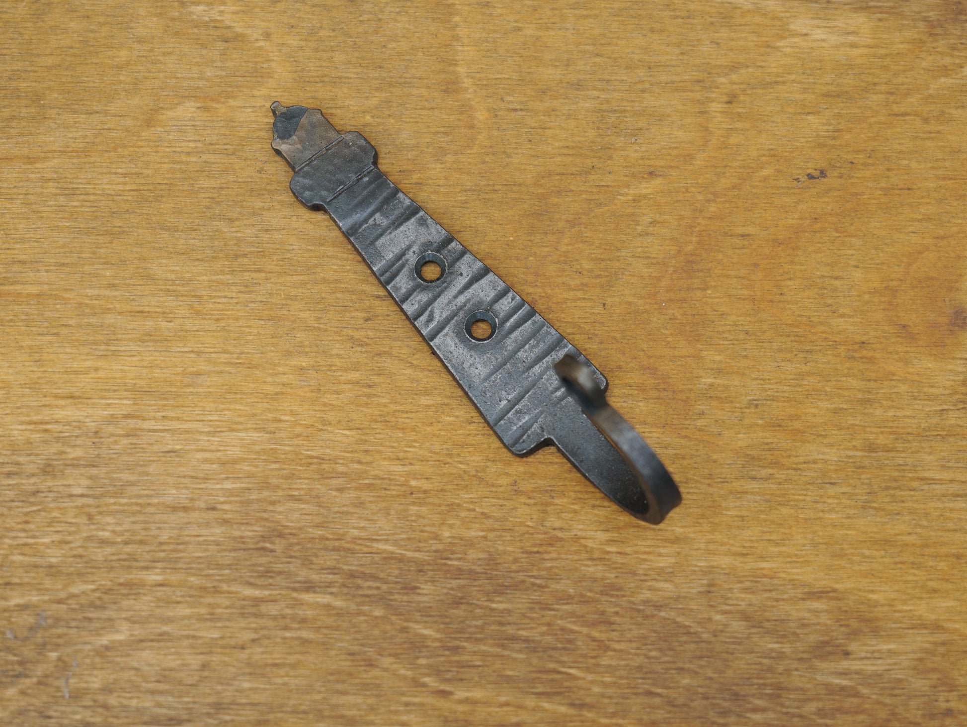 This blacksmith blank is a lighthouse hook blank. It can be decorated with chiseled lines or just textured. The first photos and last photos show examples of how you could make the finished forged product.