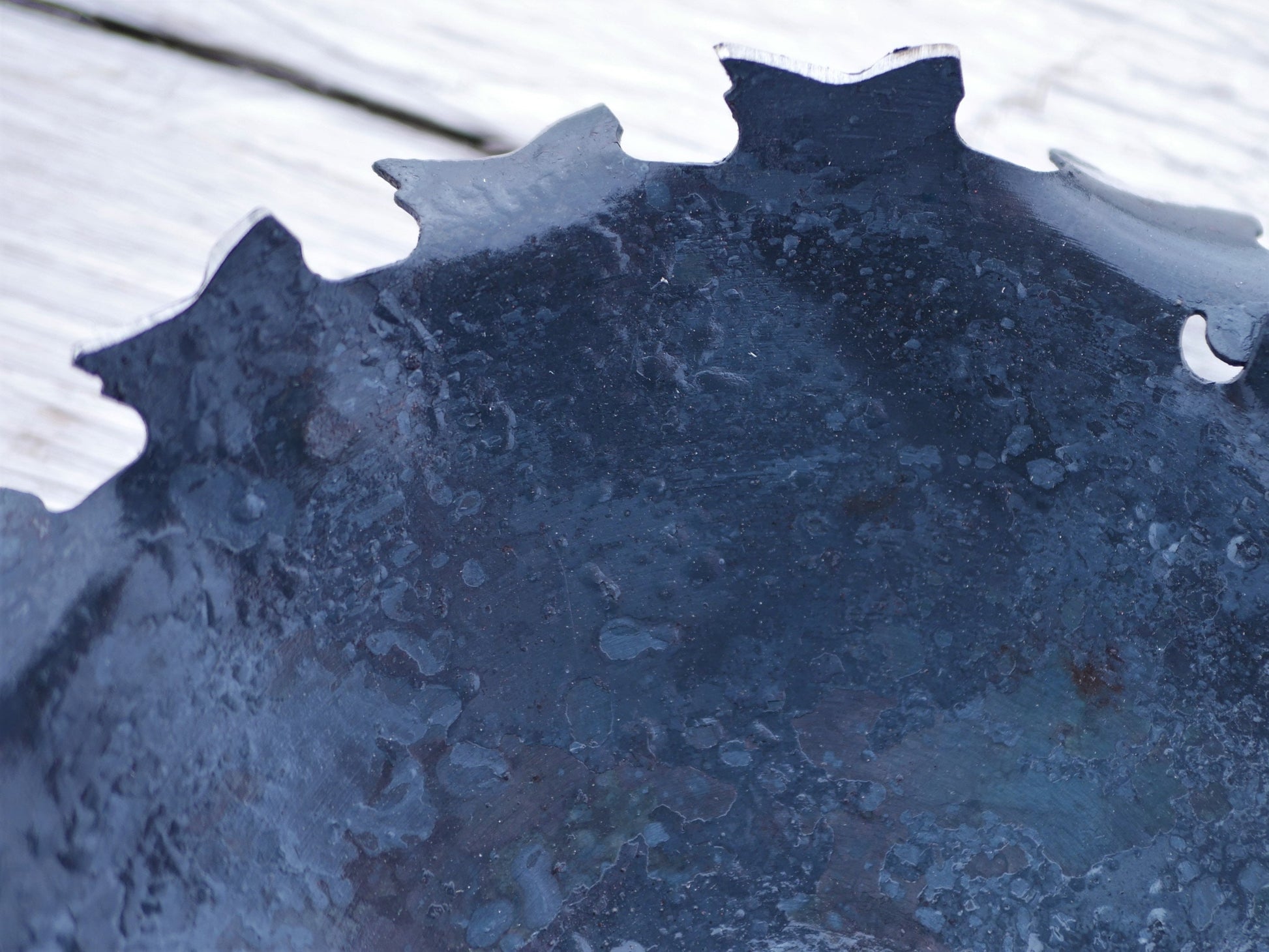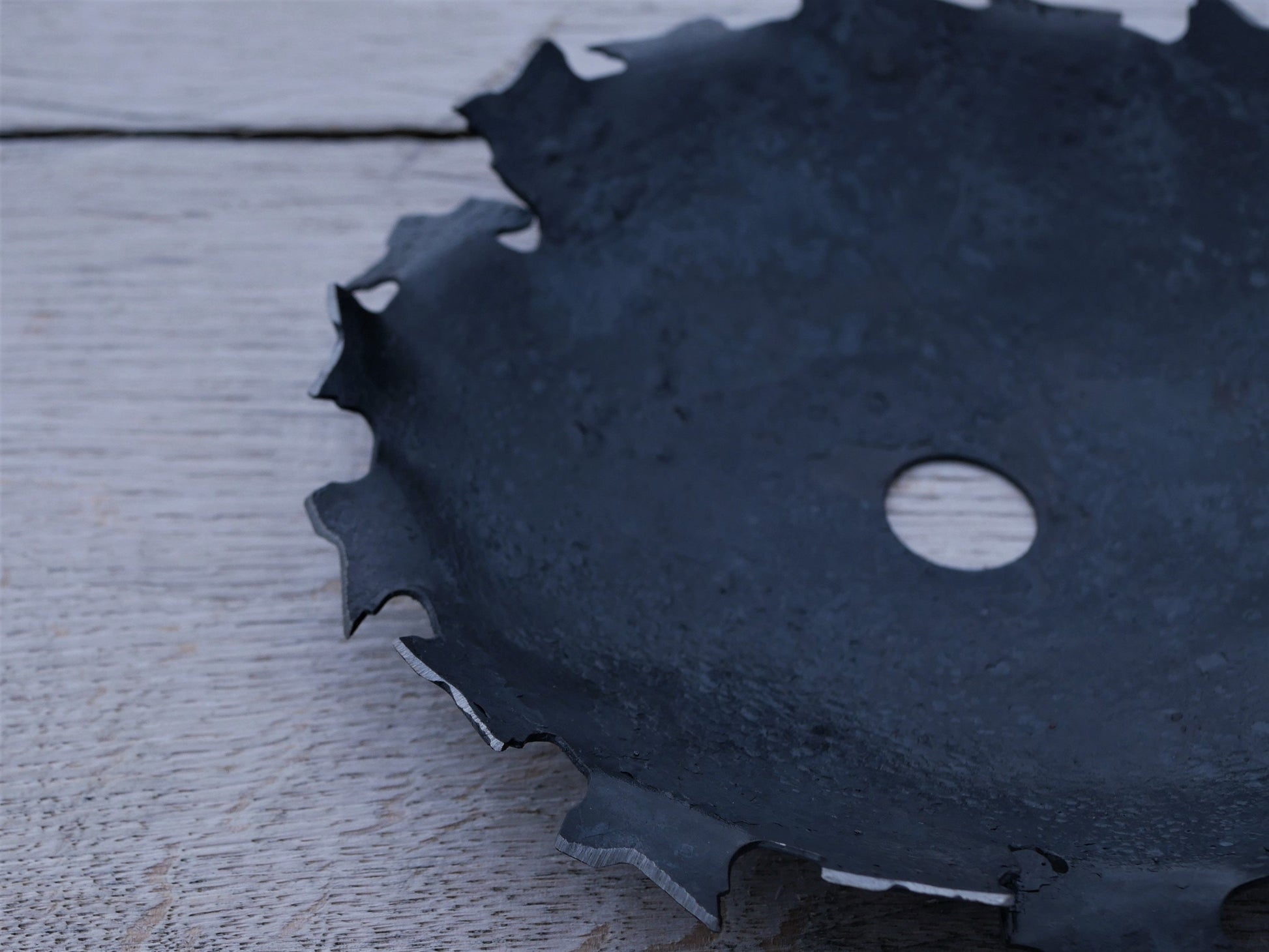 This unique hammered steel bowl was hand forged from a recycled saw blade by blacksmith Roy Adams of Christ Centered Ironworks. This metal dish is quite eye catching. The edges are dullened. This steel dish features darkened textured patina which makes for a terrific aged look. Very exquisite! Great for industrial décor, steampunk art décor, or as a gift for him/gift for men!