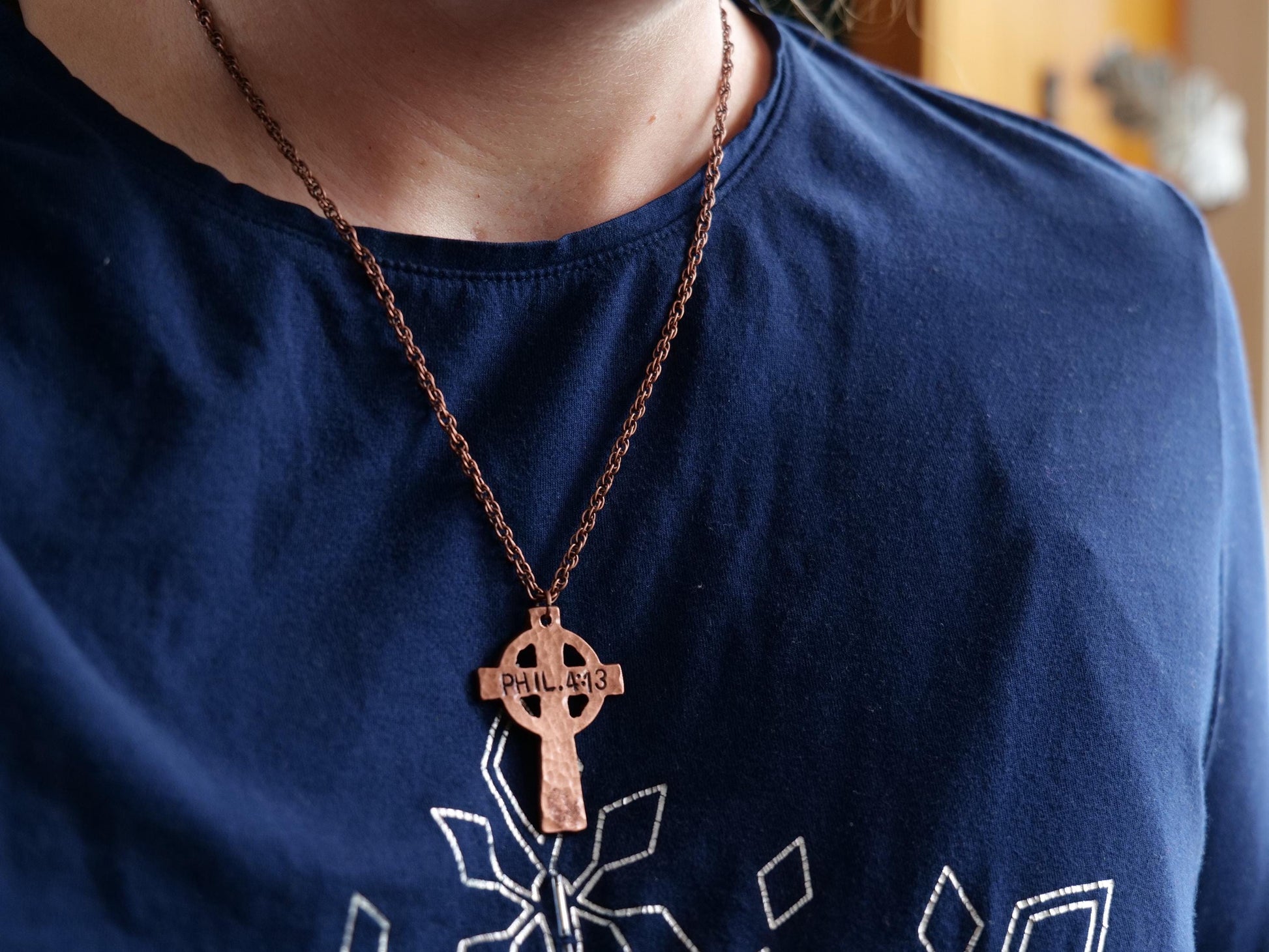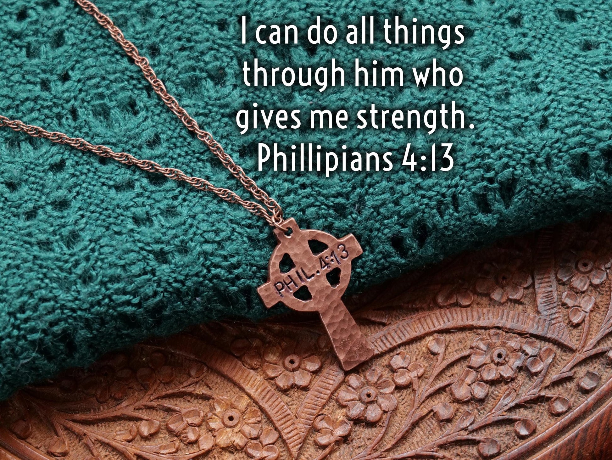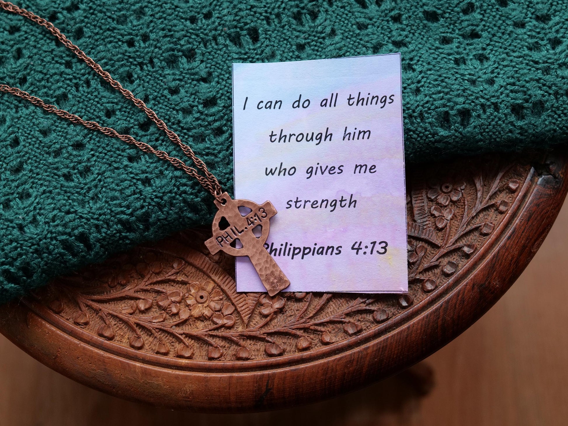 This forged decorative cross necklace was made by Jessica Adams of Christ Centered Ironworks. The hammered textured cross pendant is made from solid copper. The copper Christian cross necklace features "Phil 4:13. " stamped into it that says Philippians 4:13, "I can do all things through him who gives me strength." It will come on a print of the jewelry card shown in the photograph.