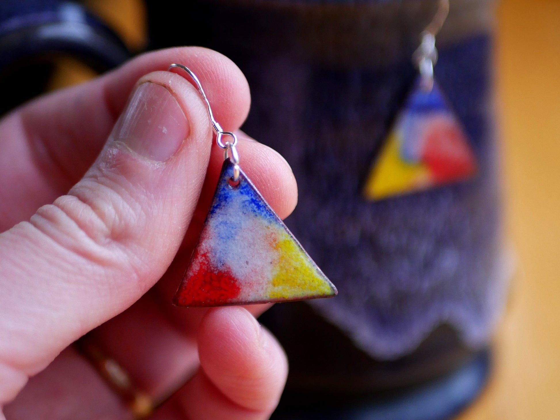 This pair of primary color enamel short dangle earrings was created by Jessica Adams at Christ Centered Ironworks. The earrings are triangle copper discs that have been enameled via the process of torch firing. These earrings were created to have a simple elegance in a modern styling.  These teacher earrings would make a great gift for a teacher in your life!