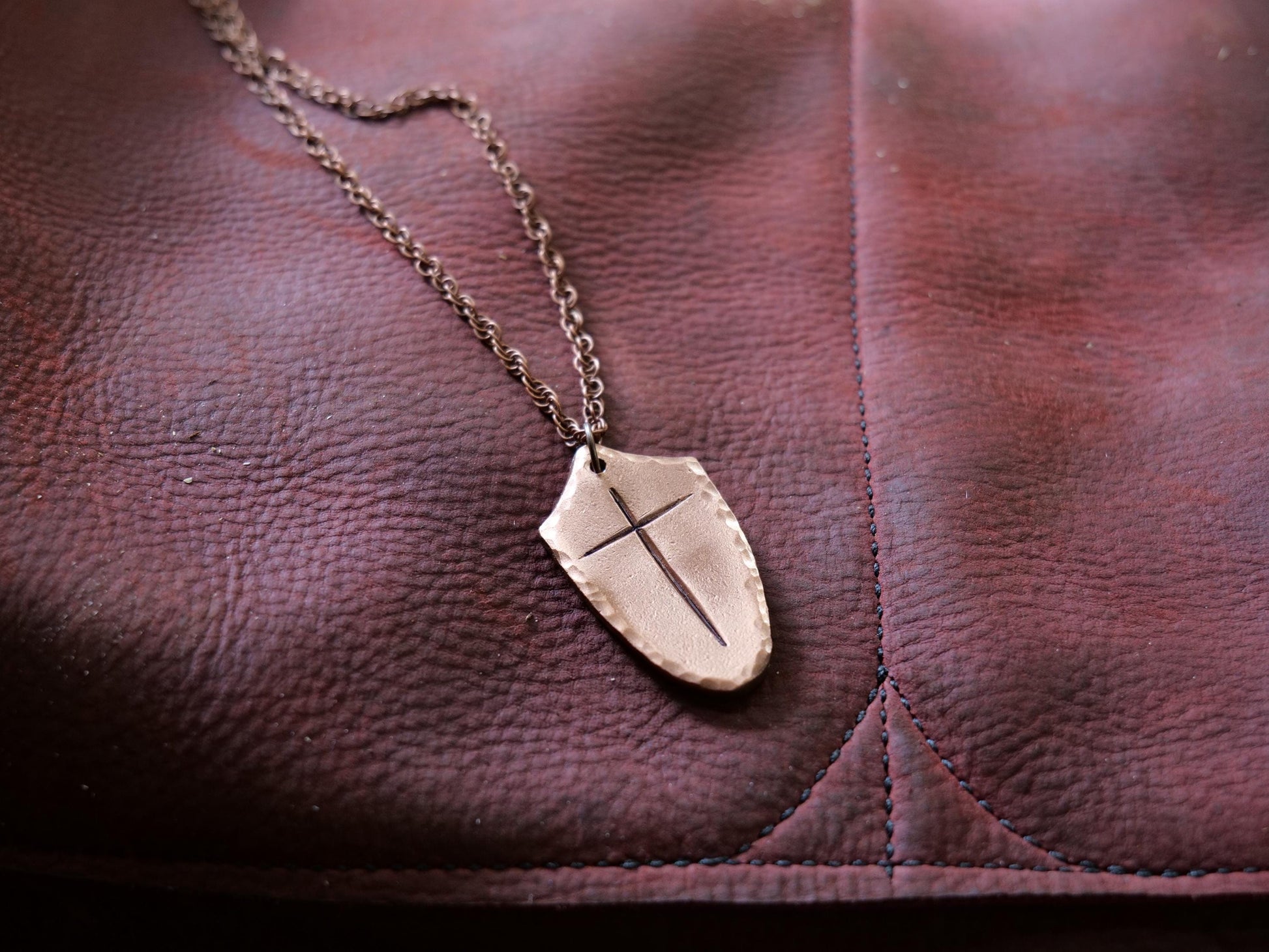 A steel version of this shield of faith necklace is available here: https://christcenteredforge.etsy.com/listing/1732697582/shield-of-faith-pendant-hammered-shield.