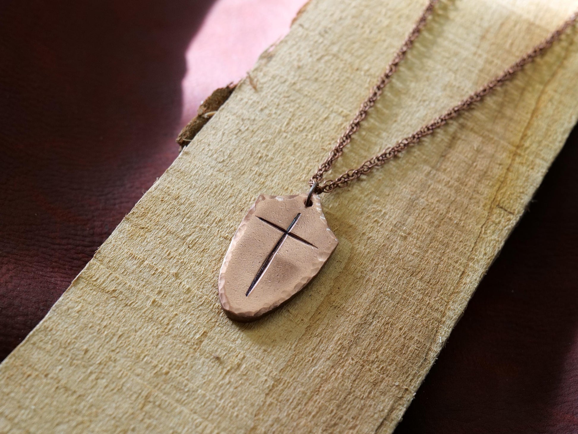 This hand forged Shield of Faith Pendant was made by Jessica Adams of Christ Centered Ironworks. The hammered textured shield pendant is made from copper. The armor of God necklace features a chiseled cross.
