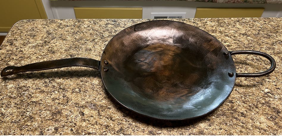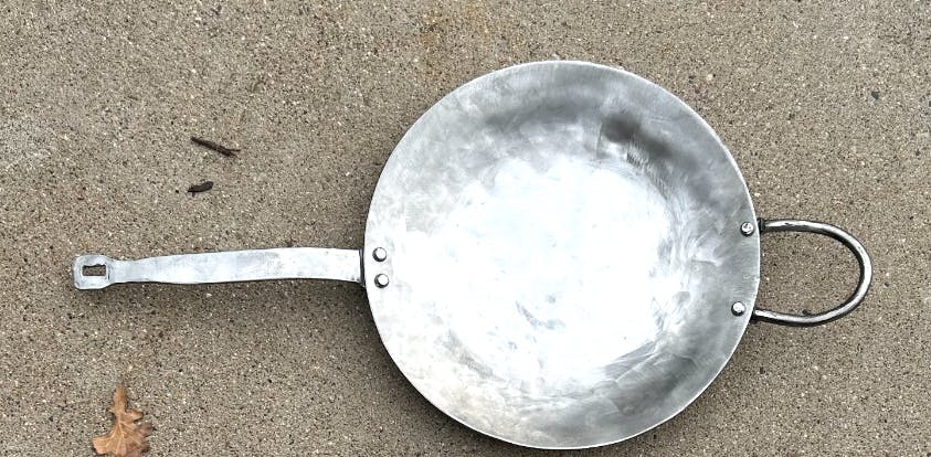This blacksmith blank can be used as a skillet body. Other uses could be to forge a steel bowl from it or a baking steel. The last photo shows what this pan body could look like when you add a forged handle to it.