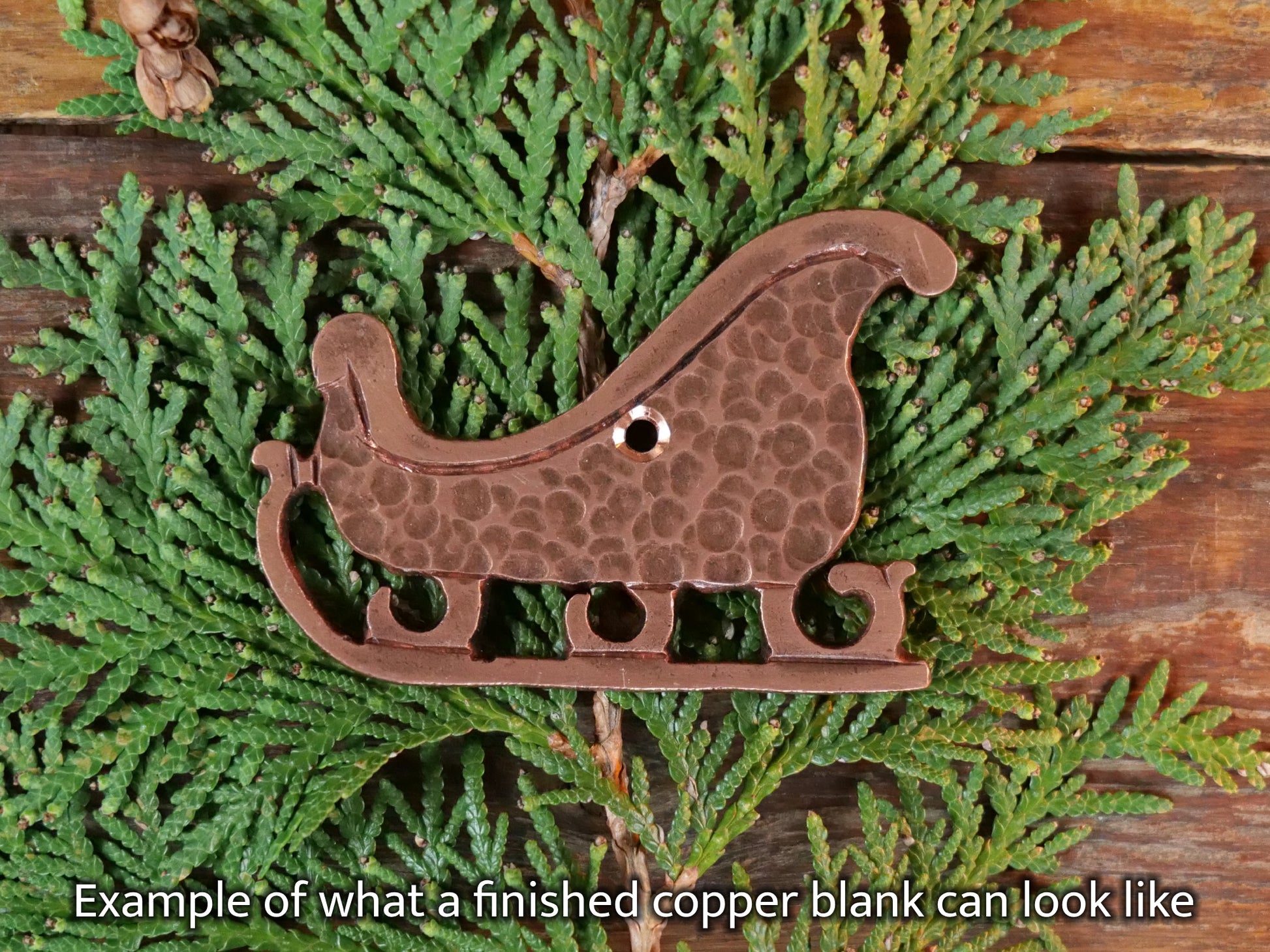 This blacksmith blank is a sleigh ornament blank. It can be decorated as a using different size chisels, punches, and metal stamps. You can see an example of what the ornament may look like completed in the last photos.