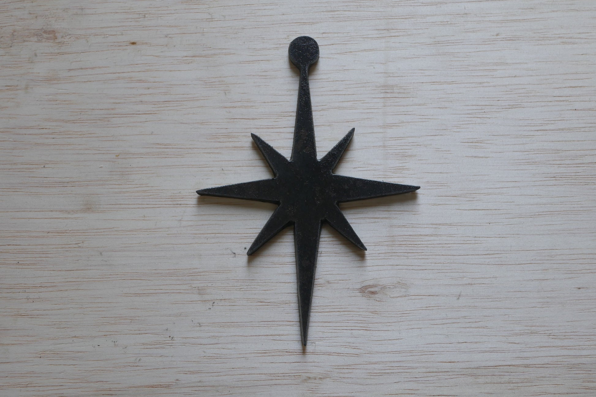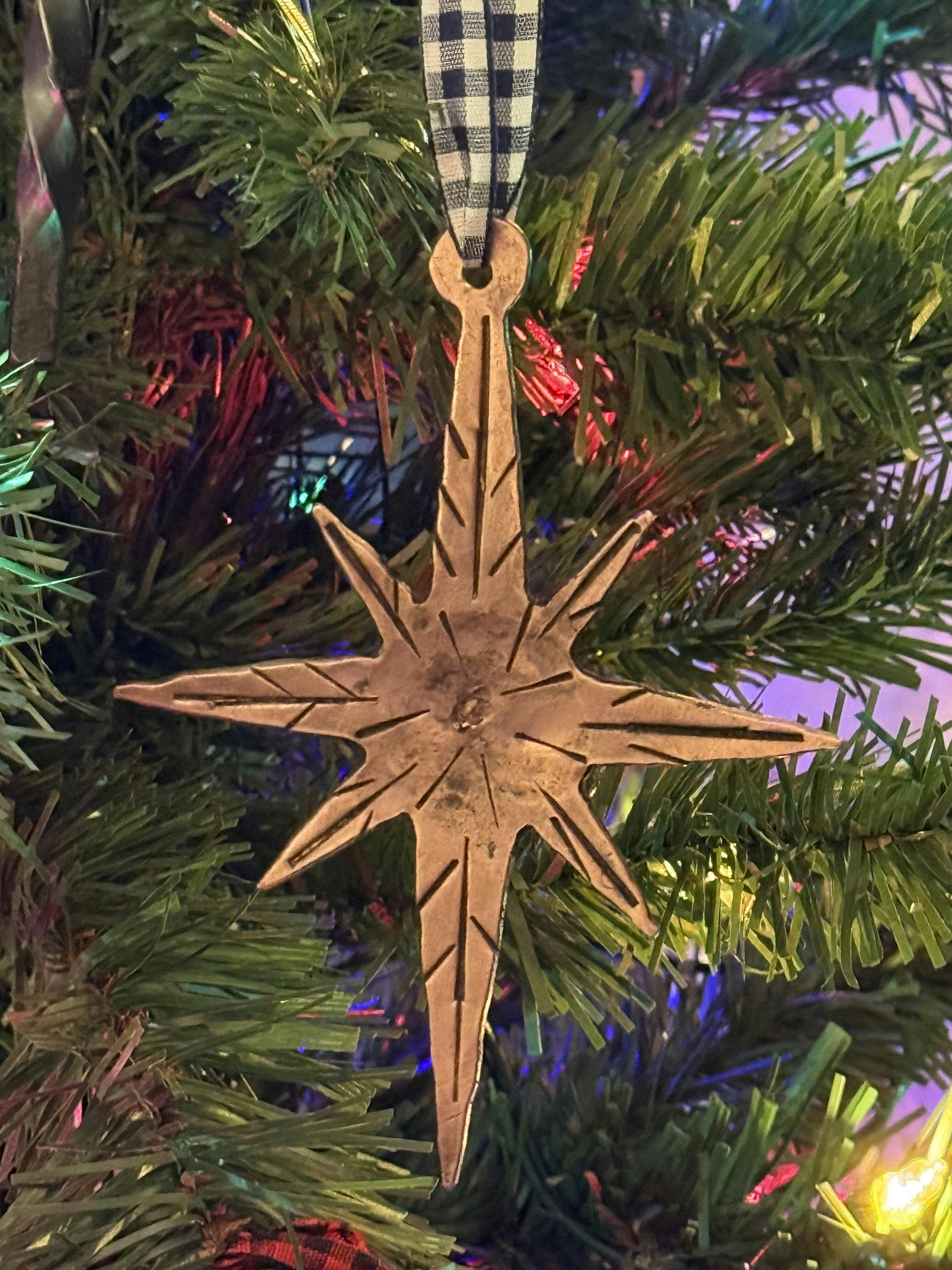 This blacksmith blank is a star ornament blank. It can be decorated as a using different size chisels, punches, and metal stamps. You can see an example of what the ornament may look like completed in the last photos.