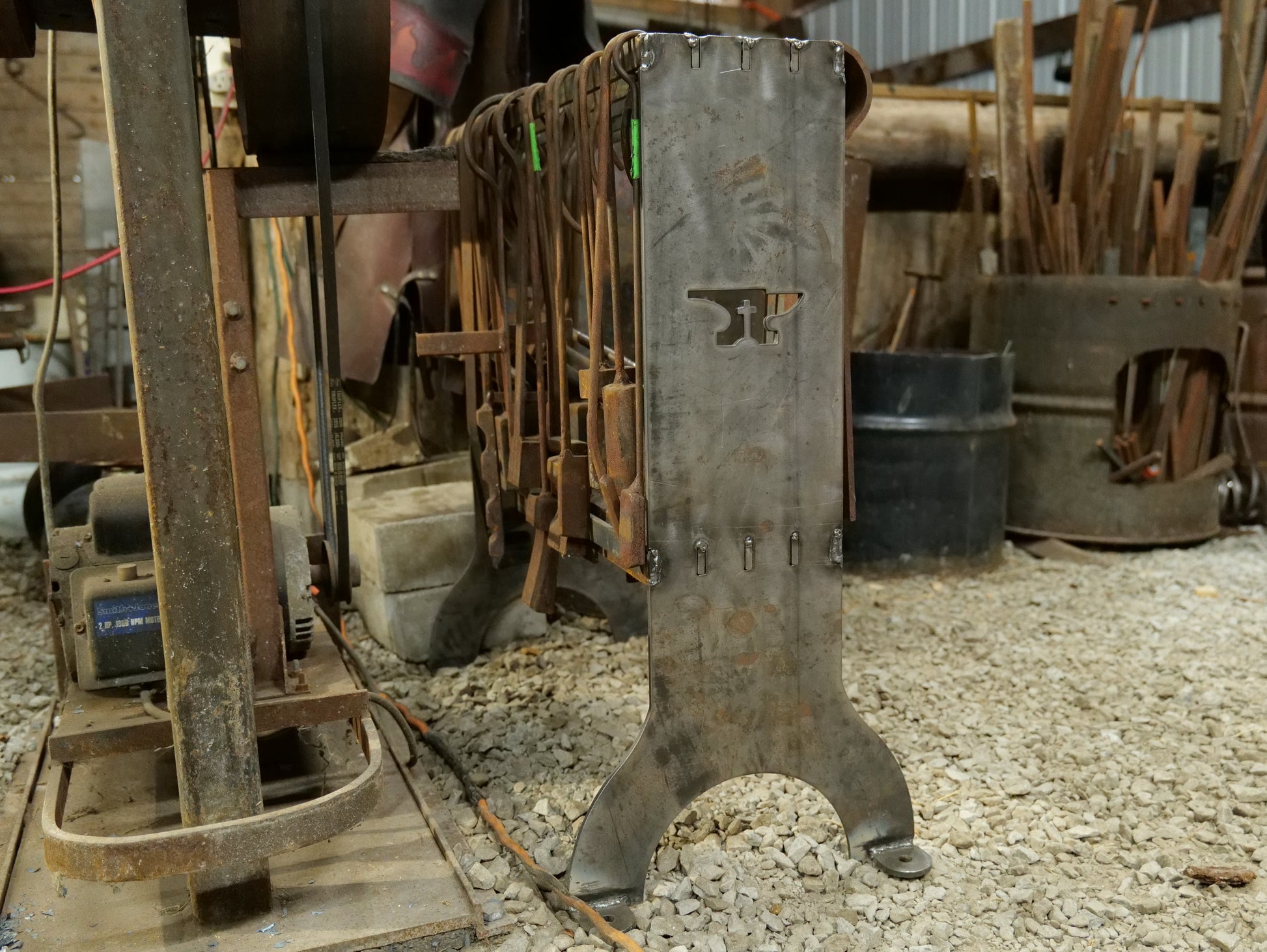 This tong and hammer rack kit will make keeping your shop organized a breeze! You can use it to hang tongs, hammers, and other tools. It is designed to be free standing. The top rack can hold tools and tongs with up to 16" long handles. The brackets are 30" tall overall and the base is 14" wide. The mounting feet can also be used with casters (if desired).